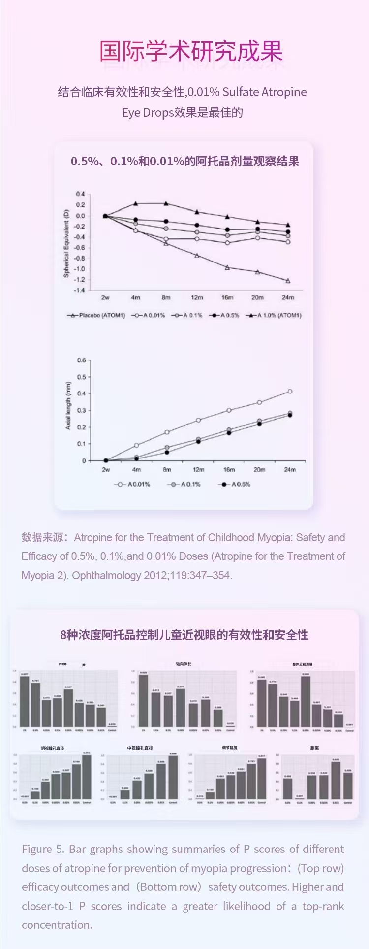 答:长期规律使用0.01%硫酸阿托品滴眼液可以有效控制儿童青少年近视增长,但停药后会有不同程度“反弹”,阿托品浓度越高,反弹越明显。一项眼科学会的报道称在停止阿托品治疗后会出现近视反弹,但使用0.01%浓度的阿托品可以使反弹最小化。因此,0.01%硫酸阿托品滴眼液反弹并不明显可以长期使用³ 。
