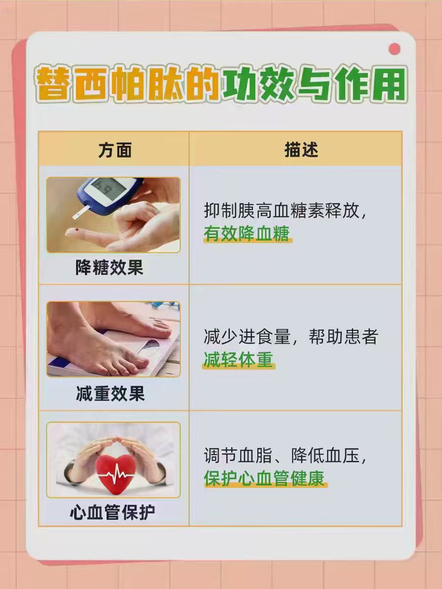 1、降糖作用:替西帕肽通过增强胰岛素分泌和抑制胰高血糖素分泌,有助于降低血糖水平。