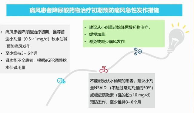 服用其他药物:现在我们也建议痛风患者在接受降尿酸治疗的初期,可以服用小剂量的秋水仙碱,比如每天服用0.5~1毫克的量,这样来预防可能出现的痛风反复发作,而且建议服用3~6个月的时间,如果服用秋水仙碱反应比较大,那么可以服用非甾体抗炎镇痛药(洛索洛芬钠、塞来昔布等),但是同样要减半药量服用。出现痛风发作时,要及时冰敷。大家都知道痛风的发作是一种的炎症,在患者的发作部位会有明显的炎症反应,比如快速的肿胀,剧烈的疼痛,局部的发热等,那么在痛风发作时及时的进行冷敷可以很好的帮助患者控制炎症反应,减轻渗出,减轻肿胀,同时可以起到很好控制疼痛的作用。一般情况下我们建议用冰水混合物,因为这样的温度是0℃,冰敷的时候一定要隔着手巾,这样会避免冻伤,而且每次冰敷的时间控制在15~20分钟,在痛风发作比较严重的时候,可以每天隔1~2小时冰敷一次。个人比较建议采用保鲜袋装一点水放在冰箱里冰冻一下,只要有一点点冰碴就可以了,这样的好处是保鲜袋非常的随形,对患者疼痛的部位刺激比较小,而且可能起到更良好范围内的冷敷作用。