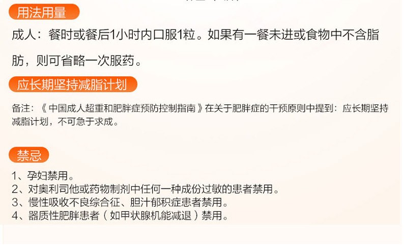 | 成分: | 本品每粒含奥利司他0.12克,辅料为:预胶化淀粉、微粉硅胶和硬脂酸镁。 |