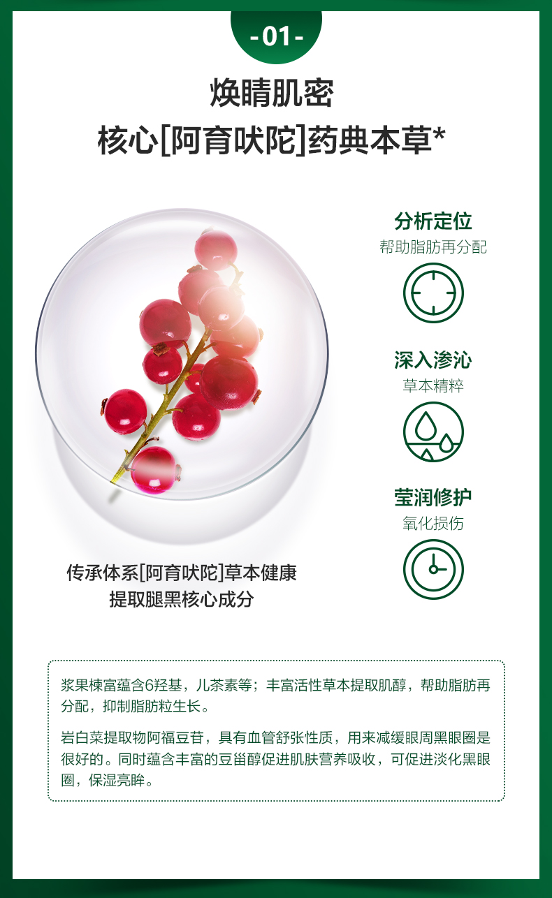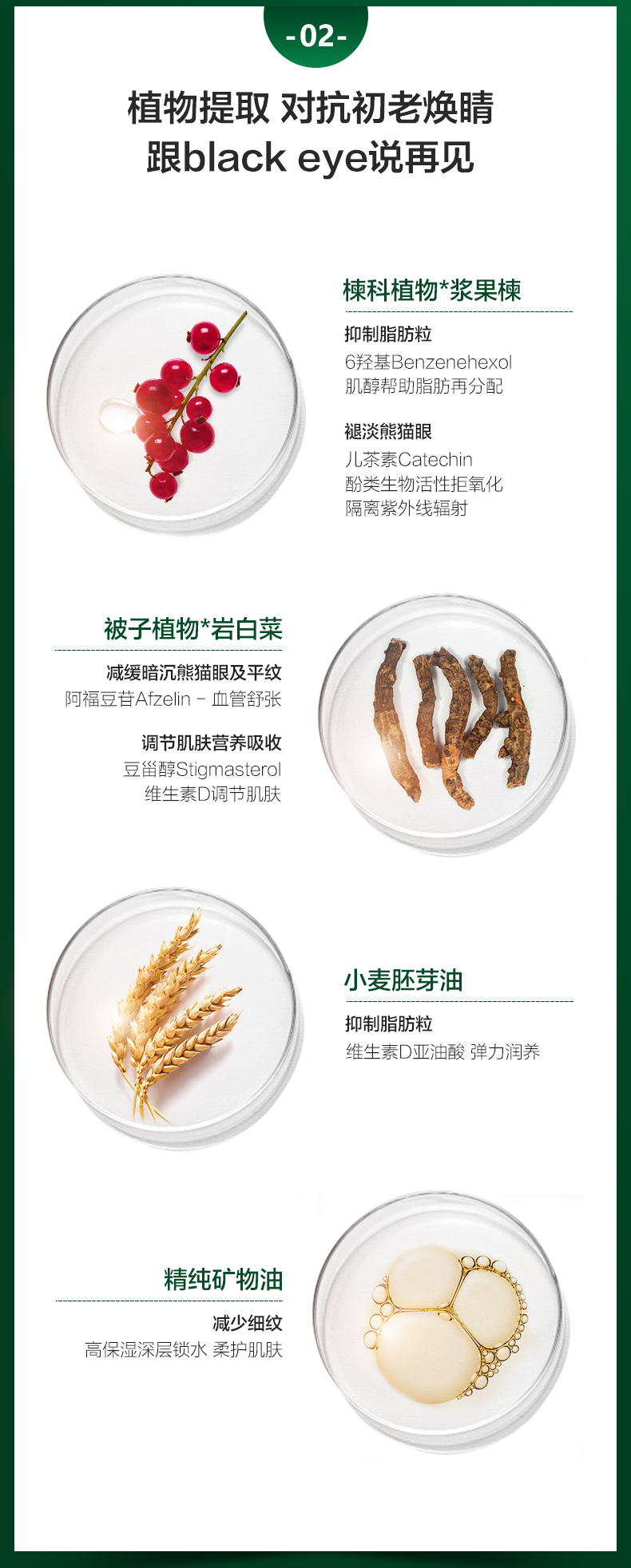 | 适用于: | 减少黑眼圈 / 祛除眼部皱纹 强效滋润眼部下皮区域 减少并避免阳光与紫外线对眼部周围薄弱敏感区域的伤害 |
