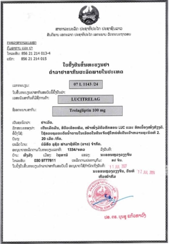 | 产品名称 : | 琥珀酸曲格列汀片 LuciTrelag ( Trelagliptin 100mg ) LUCIUS 曲格列汀100mg*20片/盒 |