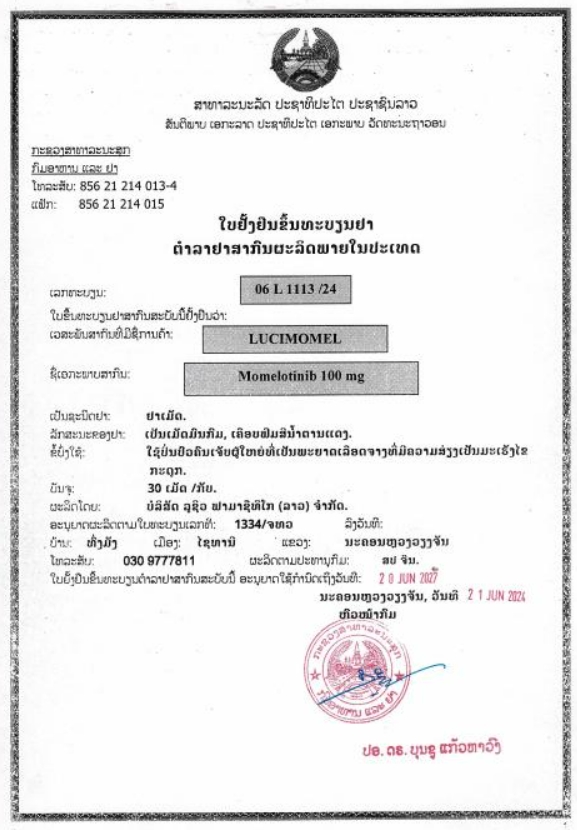 | 产品名称 : | 莫洛替尼 LuciMomel ( Momelotinib 100mg ) 莫美替尼 LuciMomel Momelotinib Tablets 100mg Ojjaara |