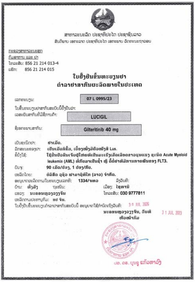 | 产品名称 : | 富马酸吉瑞替尼片(LuciGil)Gilteritinib Tablets 适加坦 XOSPATA 吉特替尼 40mg*90片/盒 |