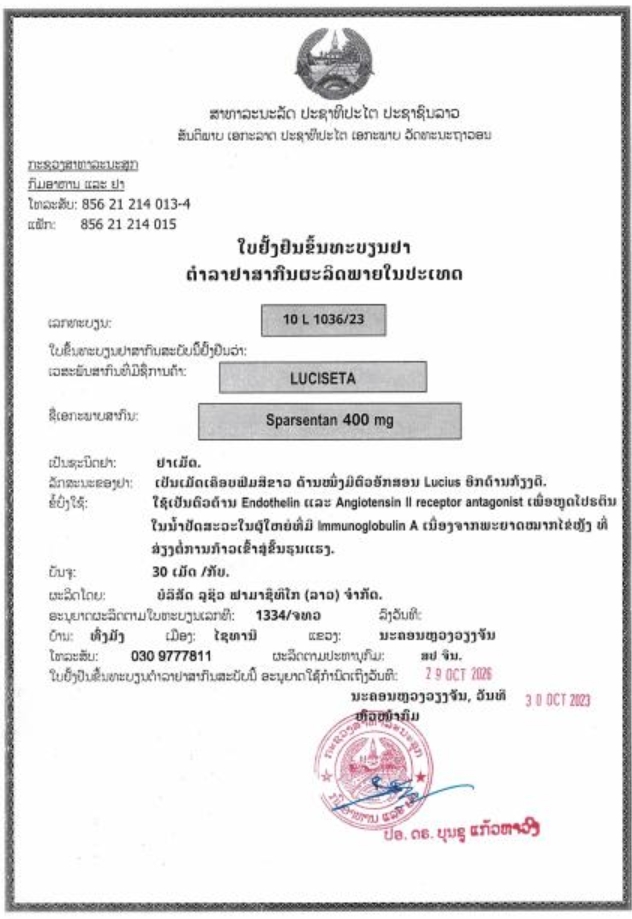 老挝国家药品批准文号:10 L 1036/23
