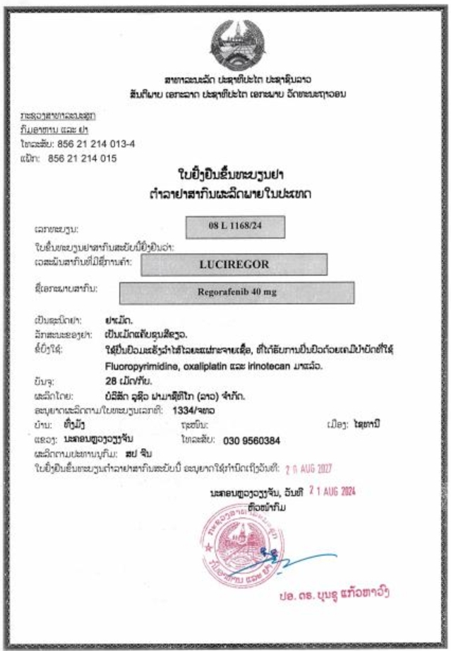| 产品名称 : | 瑞戈非尼片40mg*28片/盒 瑞格菲尼 LuciRegor Regorafenib tablets |