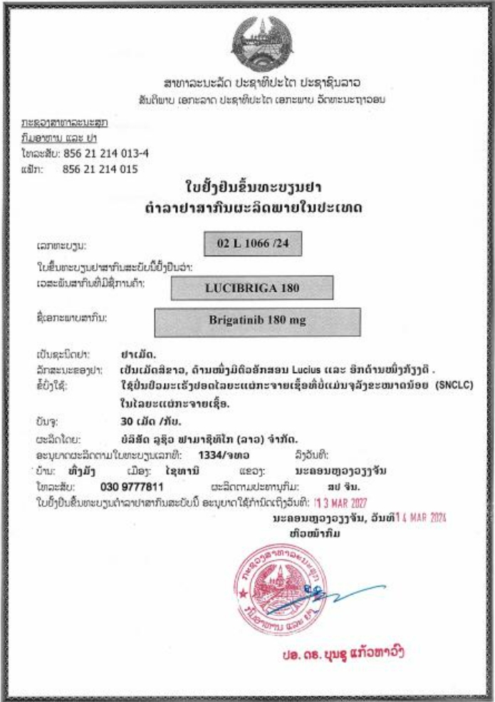 布加替尼90mg老挝药品批准文号:02 L 1065/24