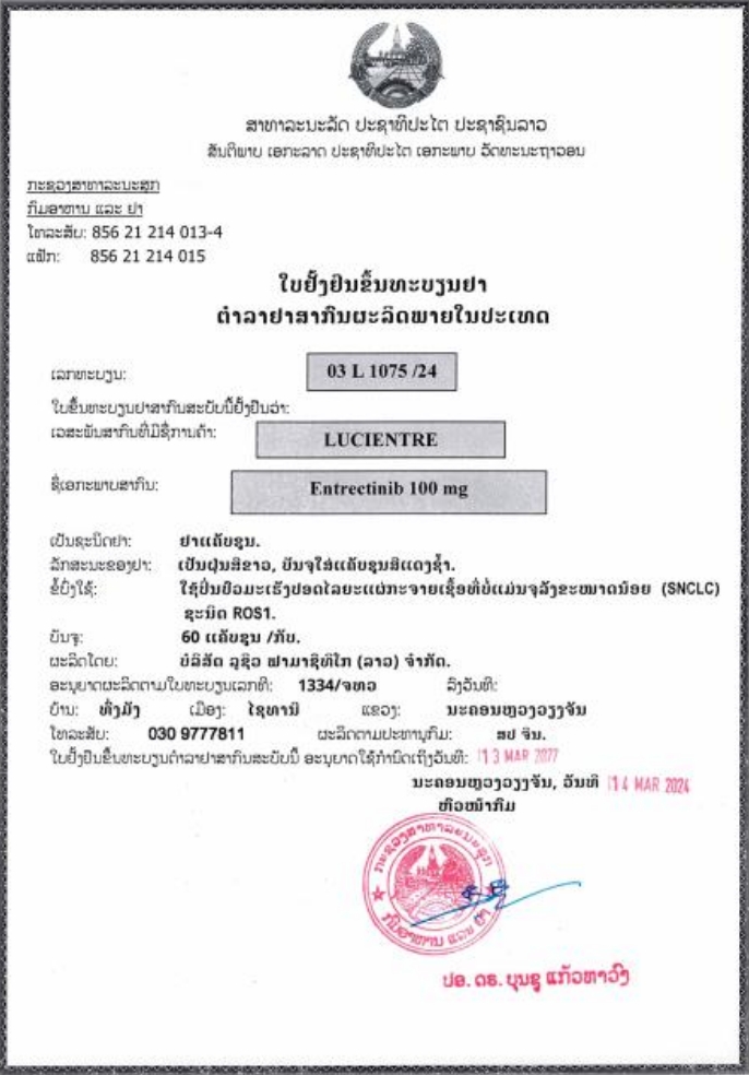 老挝国家药品批准文号:03 L 1075/24