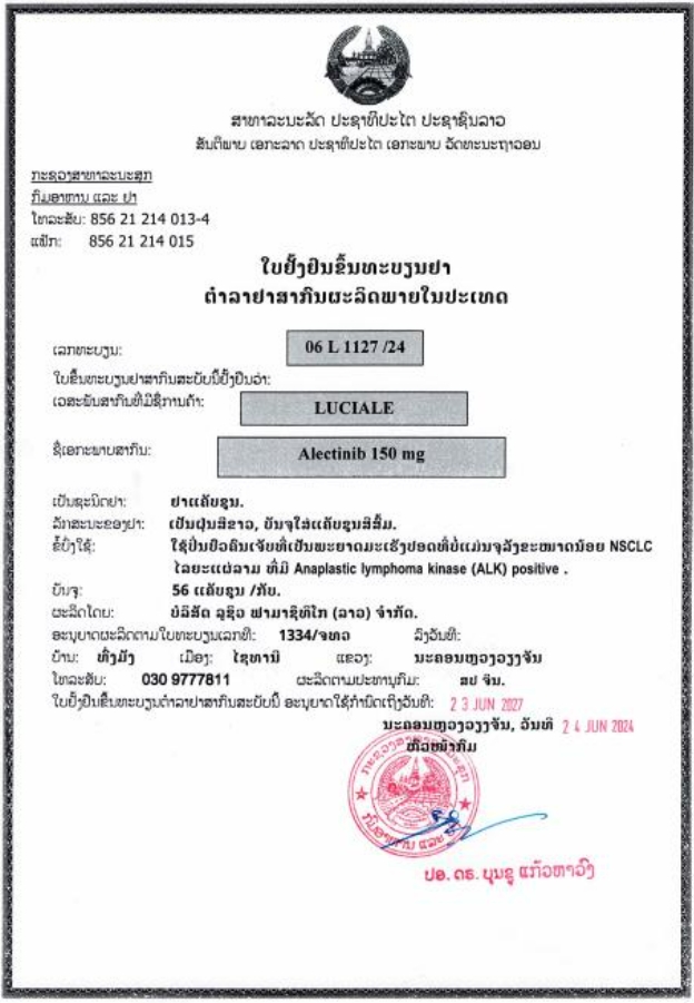 | 产品名称 : | 艾乐替尼胶囊 Alectinib capsules 阿来替尼 阿雷替尼 安圣莎 LuciAle 150mg*56粒 |