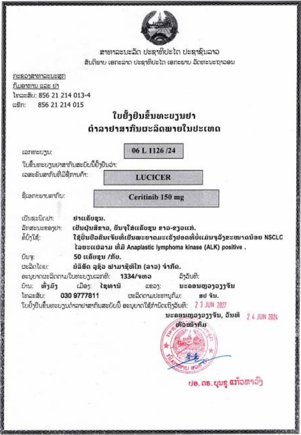 | 适用于: | LuciCer是一种激酶抑制剂,适用于治疗经FDA批准的检测呈间变性淋巴瘤激酶(ALK)阳性的转移性非小细胞肺癌(NSCLC)的成人患者。 |