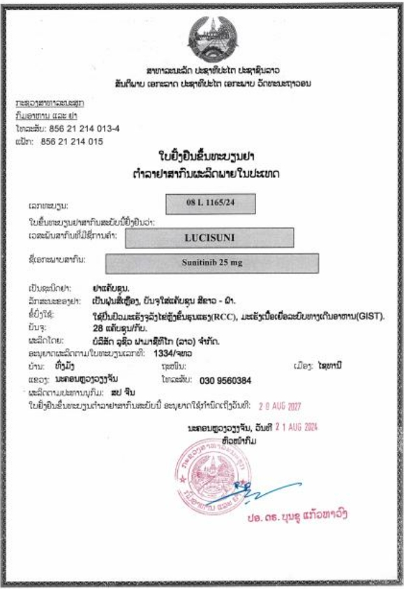 舒尼替尼胶囊25mg老挝国家药品批准文号:08 L 1165/24