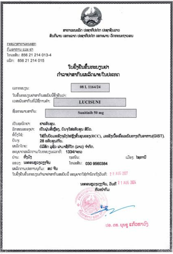 舒尼替尼胶囊12.5mg老挝国家药品批准文号:08 L 1166/24