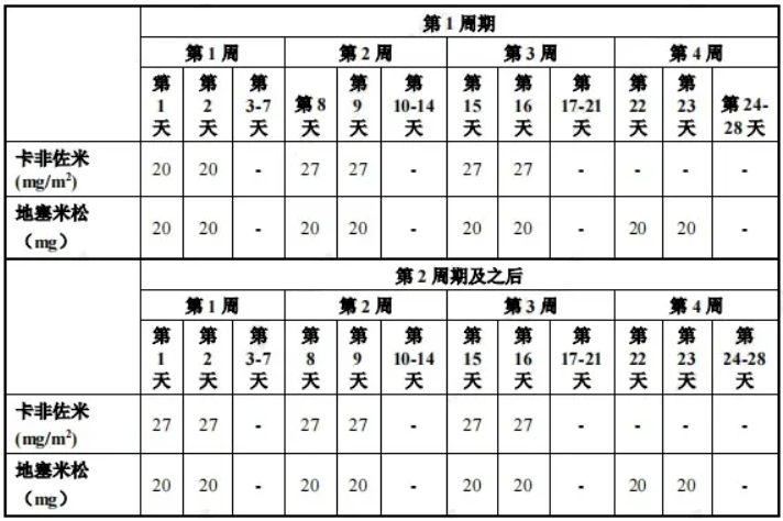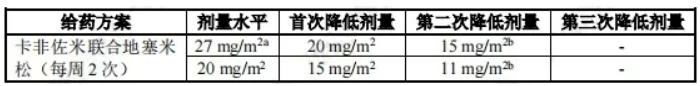 对卡非佐米采取的推荐措施和剂量调整请参见表 2。如何降低剂量水平请参见表 3。地塞米松的推荐剂量信息请参见地塞米松处方信息。
