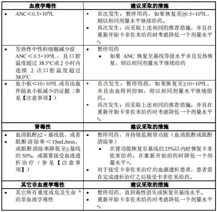 卡非佐米治疗期间可能发生的严重不良反应包括:心力衰竭、心肌梗死、心脏骤停、心肌缺血、间质性肺病、肺炎、急性呼吸窘迫综合征、急性呼吸衰竭、肺动脉高压、呼吸困难、高血压(包括高血压危象)、急性肾损伤、肿瘤溶解综合征、输注相关反应、胃肠道出血、颅内出血、肺出血、血小板减少症、肝衰竭、乙型肝炎病毒再激活、可逆性后部脑病综合征(PRES)、血栓性微血管病和血栓性血小板减少性紫癜/溶血尿毒综合征(TTP/HUS)。