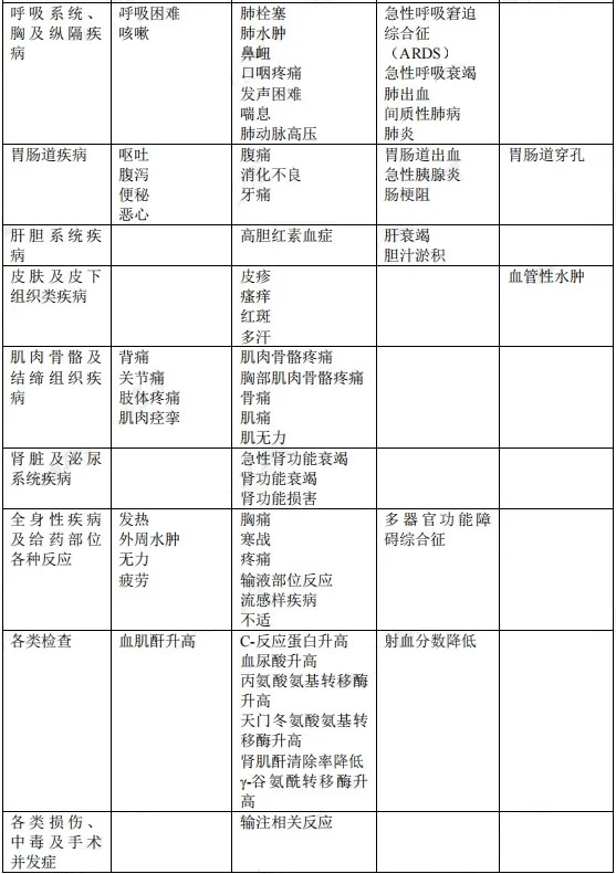 对不同研究进行交叉比较,显示以下不良反应可能存在剂量相关性:心力衰竭、呼吸困难、高血压、肺动脉高压。