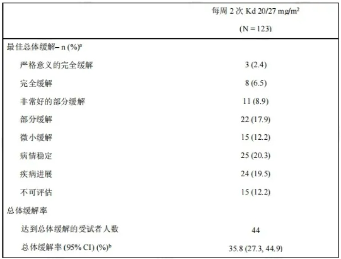 a 最佳总体缓解是指受试者在研究期间的最佳缓解。总体缓解是指最佳总体缓解达到部分缓解、非常好的部分缓解、完全缓解、或严格意义的完全缓解。