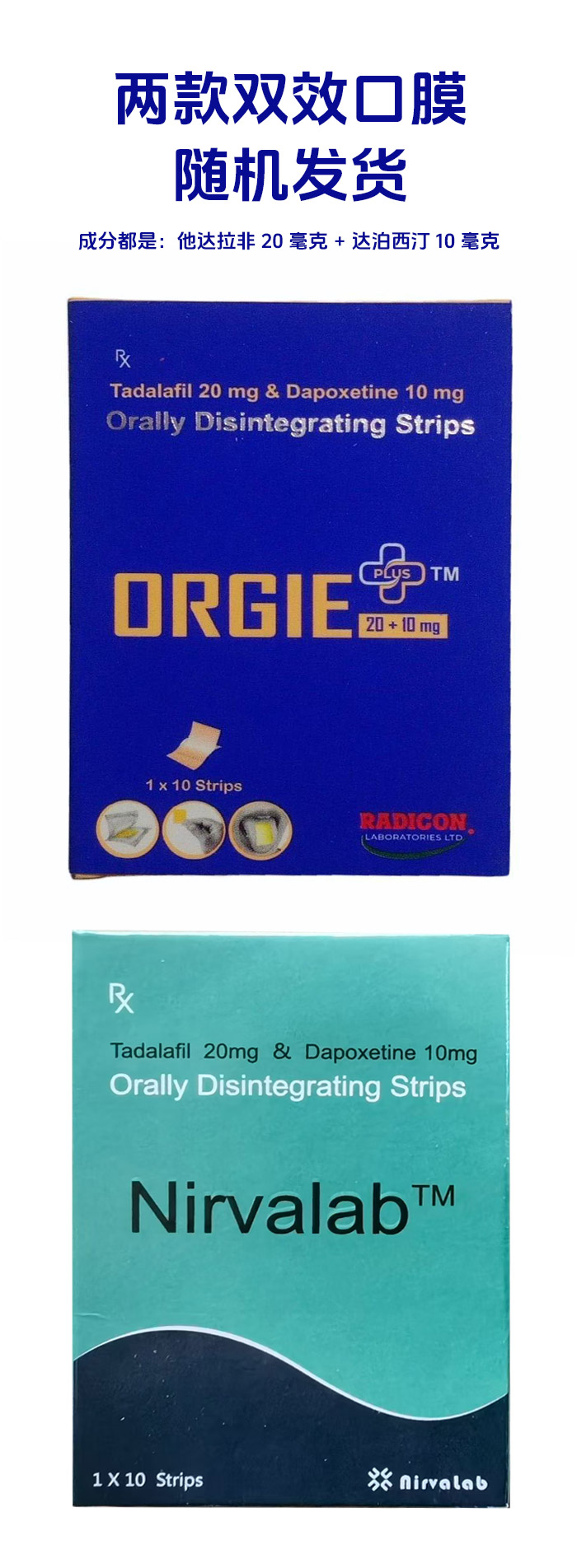 | 产品名称 : | 双效口溶膜片 口腔崩解条 Orgie Tadalafil Dapoxetine Tablet 10片/盒 |