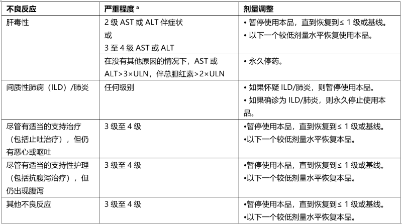 最常见的不良反应 (≥ 20%) 是腹泻、肌肉骨骼疼痛、恶心、疲劳、肝毒性和咳嗽。