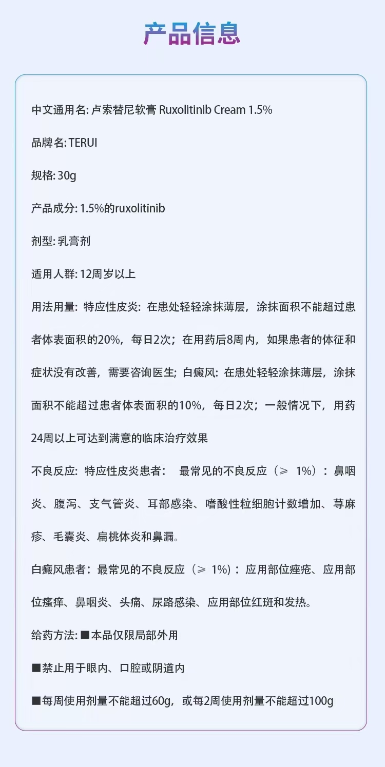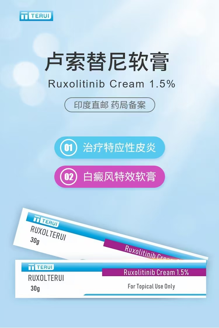 | 产品名称 : | 芦可替尼软膏/卢索替尼乳膏 RUXOLTERUI Ruxolitinib Cream 1.5% 鲁索替尼 卢索替尼 |
