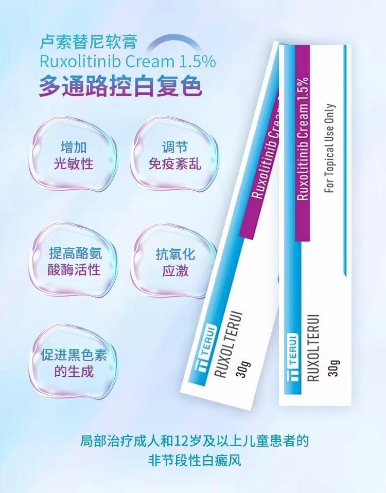 | 适用于: | 1.5%芦可替尼乳膏,用于治疗非节段型白癜风。这是首个且唯一一个获得批准的、适用于12岁及以上儿童和成人白癜风患者的药物,能够帮助恢复皮肤色素。 |