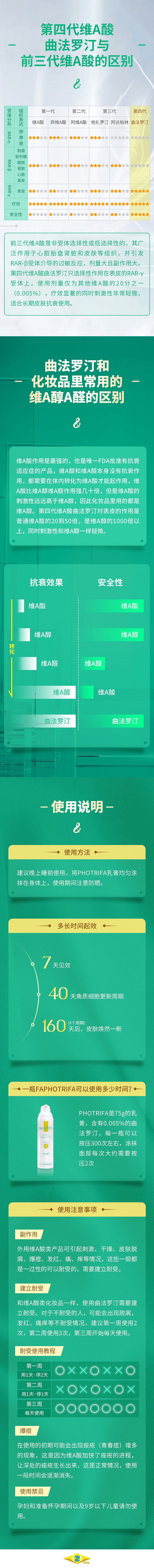 | 用法用量: | 每晚在洁净干燥的皮肤上涂一层薄薄的本品,应该足以覆盖面部(即前额、脸颊、鼻子和下巴),两泵应足以覆盖躯干(即可触及的上背部、肩部和胸部),如果出现癌疮,可以对中背部和下背部额外涂抹一泵,建议从治疗开始就根据需要使用保湿剂,避免接触眼睛、嘴唇、鼻旁皱褶以及粘膜,并且只能局部使用,不适用于口服、眼科或阴道。 |