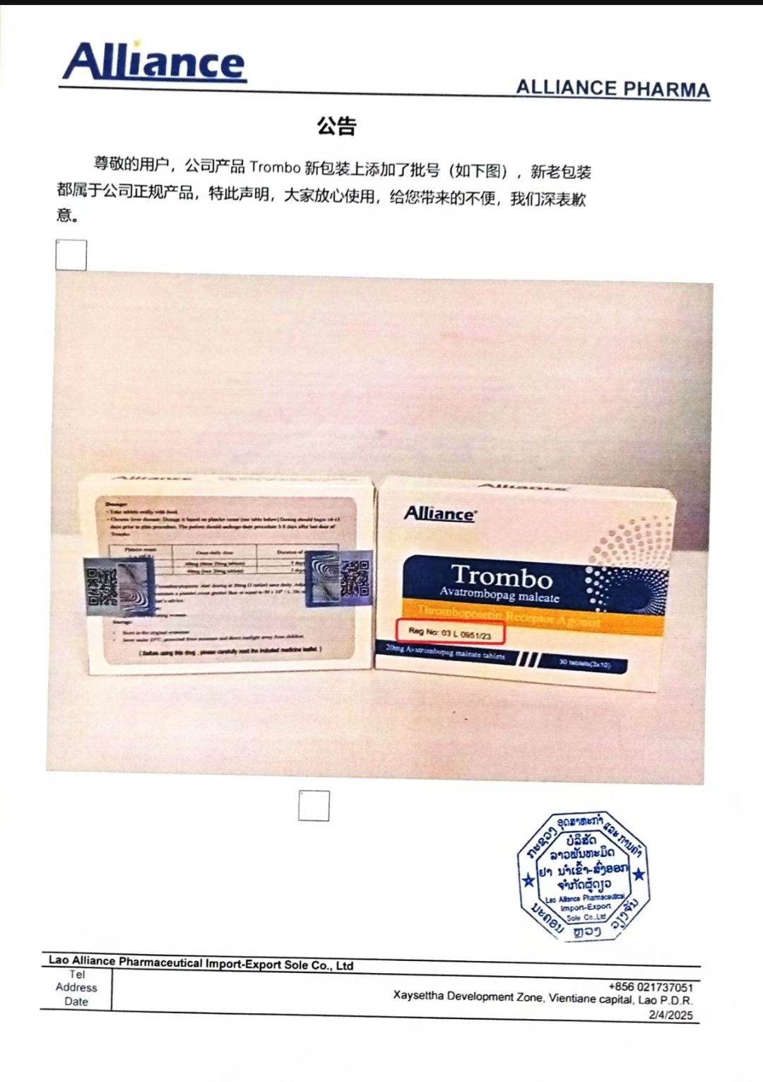 老挝国家药监局批准文号:10 L 0951/23.
