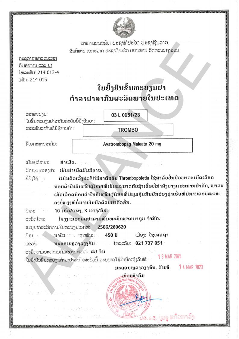 | 产品名称 : | 马来酸阿伐曲泊帕片20mg*30片/盒(苏可欣)Trombo Avatrombopag |