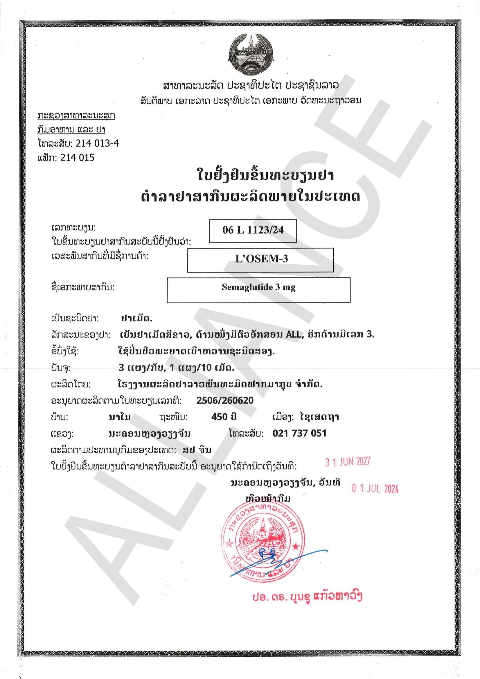 3mg司美格鲁肽老挝国家药监局注册文号证书