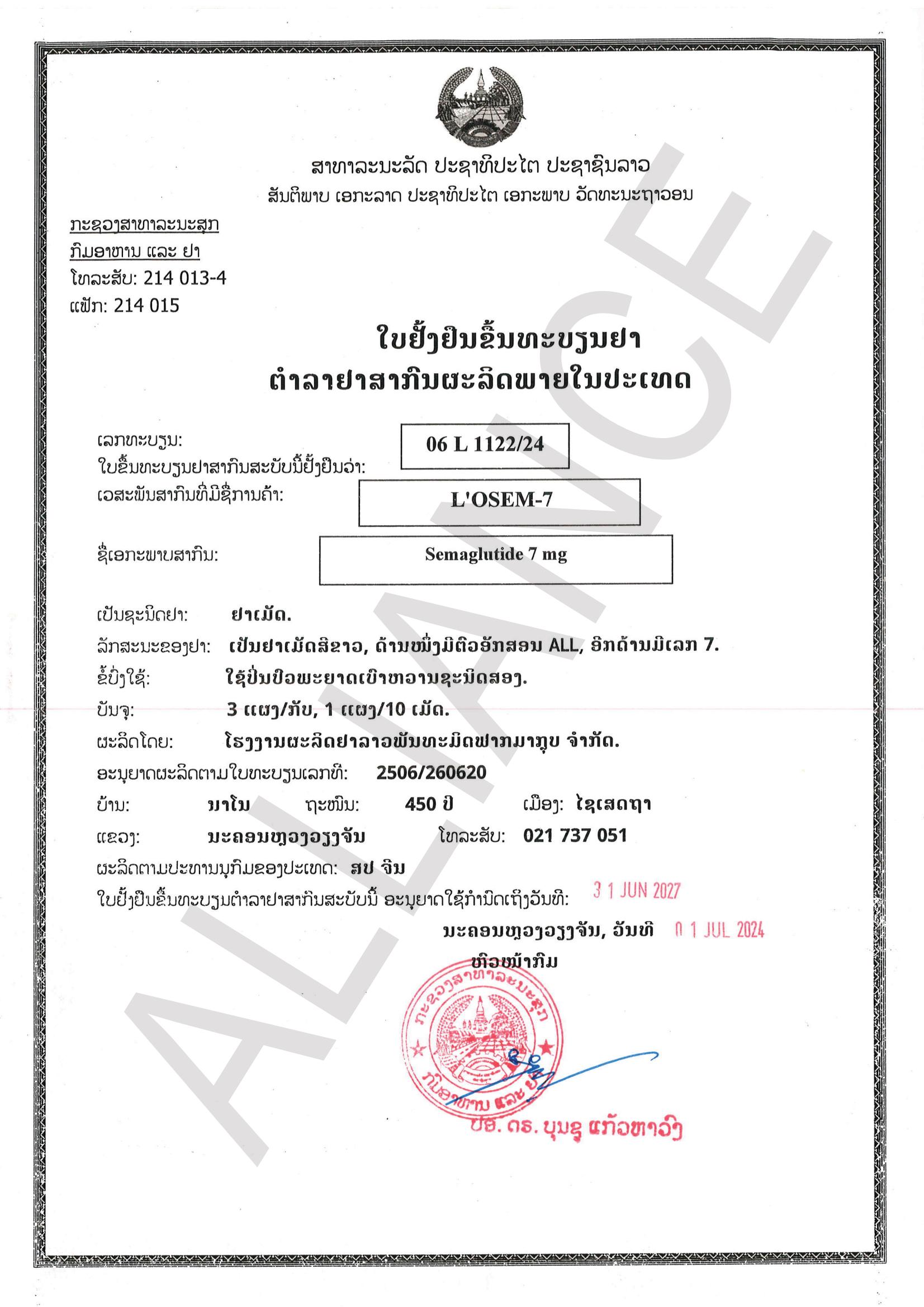 7mg司美格鲁肽老挝国家药监局注册文号证书